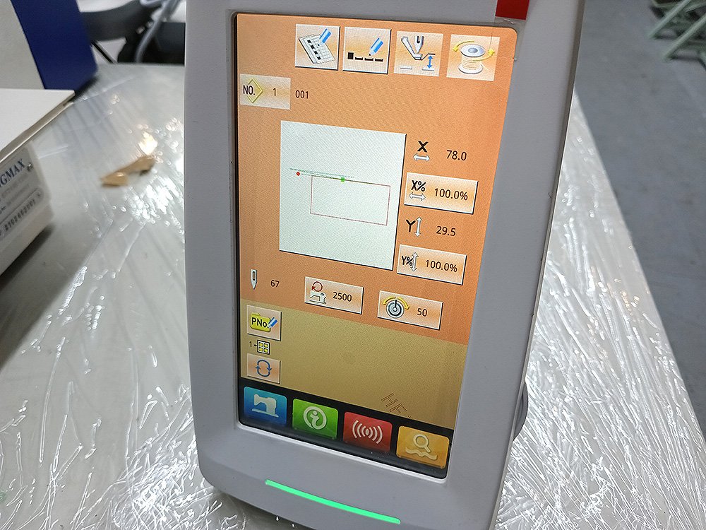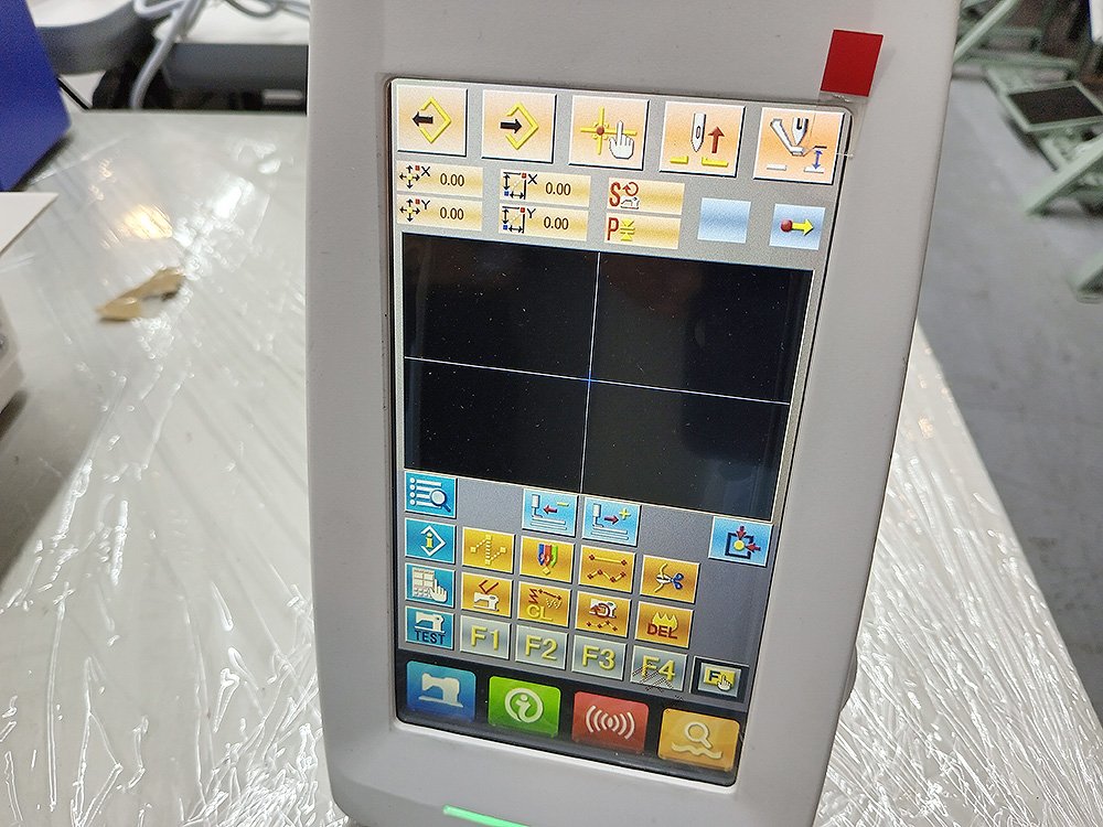 This particular machine is factory supplied with a 360 device – also known as a flip-flop device – that allows you to sew labels to flat goods in different sizes. Also, the 360 device can be removed if not needed and the machine can be set up to sew many different patterns such as Box-X, W stitch patterns, Hook and Loop, etc. on webbing and other materials. Full patterns design capability is available via integrated LCD touch panel. The panel uses the renown DAHAO software system found on 90 percent of new pattern sewing machines that is easy to use with minimal programming experience.