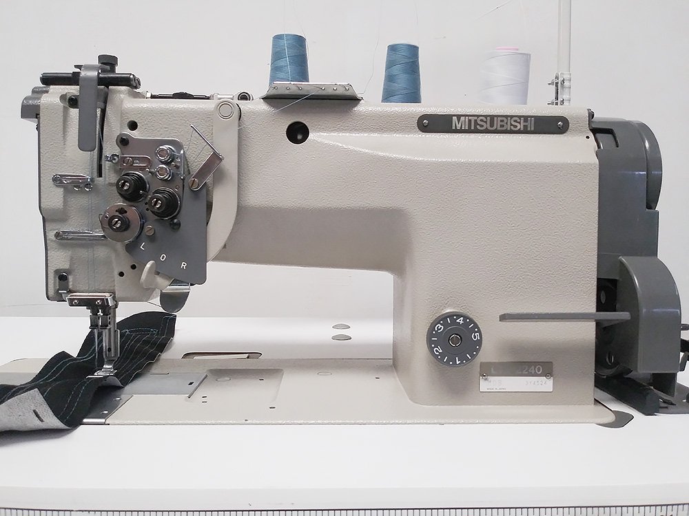 MITSUBISHI LT2-2240-MOB is a high speed double needle lockstitch sewing machine with needle feed and split needle bar system. Ideal for sewing corners by engaging and disengaging left or right needles then continuing with both needles. Denim, knits and cottons can be sewed with precision.