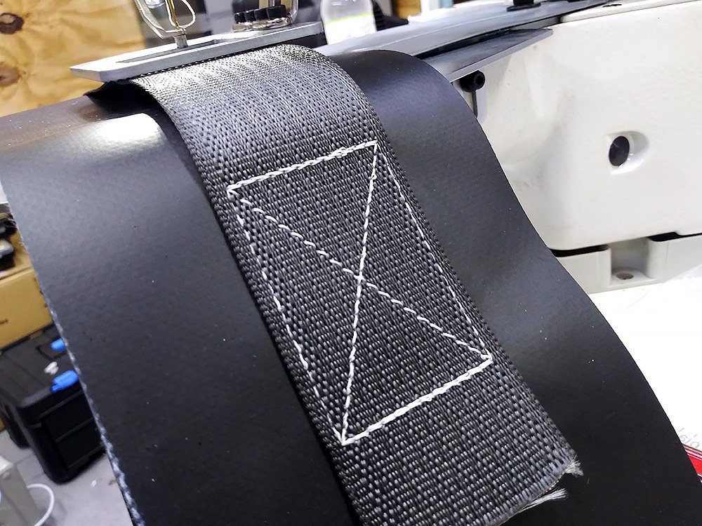 This machine will be best at sewing 2″ webbing widths (and smaller).  The machine is driven by high torque stepping motors and will sew up to 6 to 8 layers of webbing – depending on webbing density.