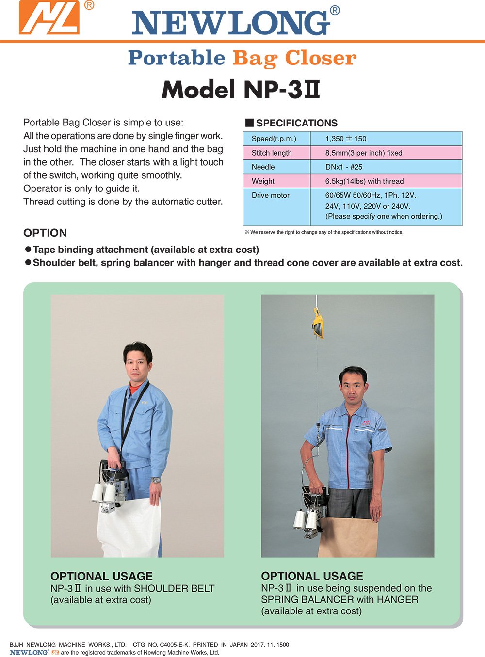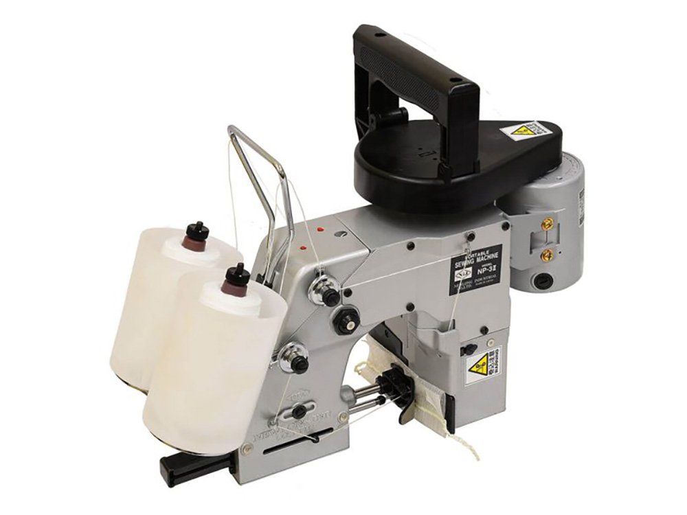The Newlong NP-3II portable bag closer for filled bags has a robust construction specially designed for use with GeoTextile fabrics. The NP-3II features a double thread chain stitch (with one needle and looper) for a high strength and tight closure with automatic thread cutting.